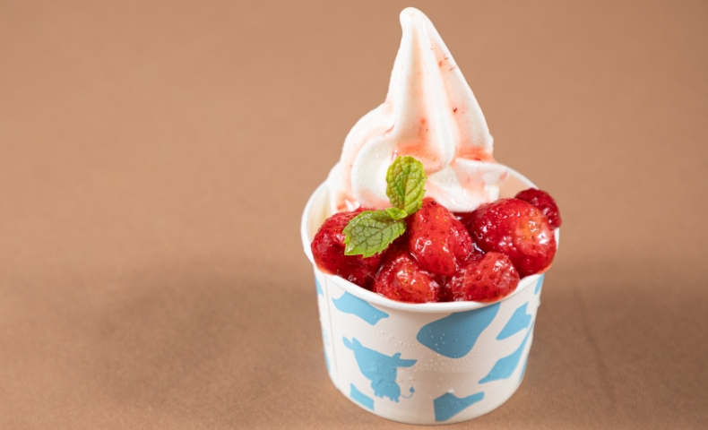 真っ白なソフトに鮮やかな赤の果実ソースがとろりとかかり、見た目にも華やかです。ひと口運べば、濃厚なソフトの甘さといちごの甘酸っぱさが重なり合い、心まで満たされるご当地スイーツに。