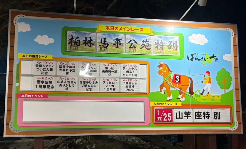ばんえい十勝の協賛レースは、ただ観戦するだけでは味わえない「自分ごと感」を一気に引き上げてくれる制度でした。玄関の看板や館内モニター、出走表、馬券に自分たちのレース名が載り、場内アナウンスでも呼ばれる。この興奮は想像以上でした。