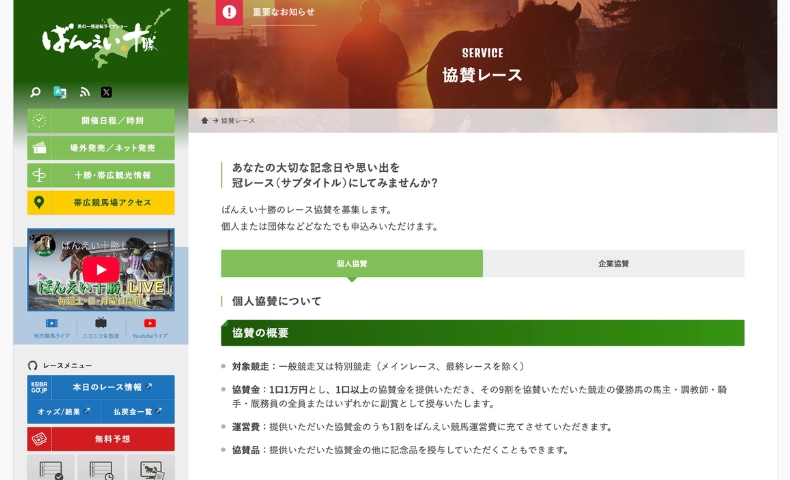 協賛と聞くと、企業がそれなりの金額を出してPRに使うイメージが強いかもしれません。けれど、ばんえい十勝の協賛レースは個人でも申し込みOK。1口1万円〜で、入籍記念や誕生日など節目のお祝いまで、好きな言葉をレース名にして残せます。これ、思った以上にロマンがあります。