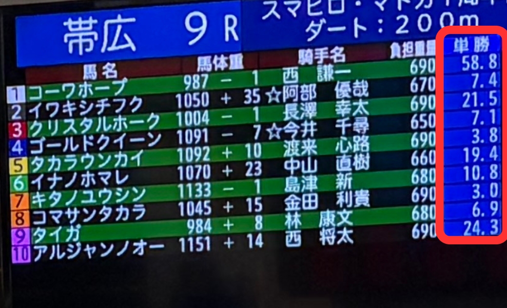 パドックで「この馬いいかも」と目星をつけたら、次は館内モニターでオッズをチェックします。