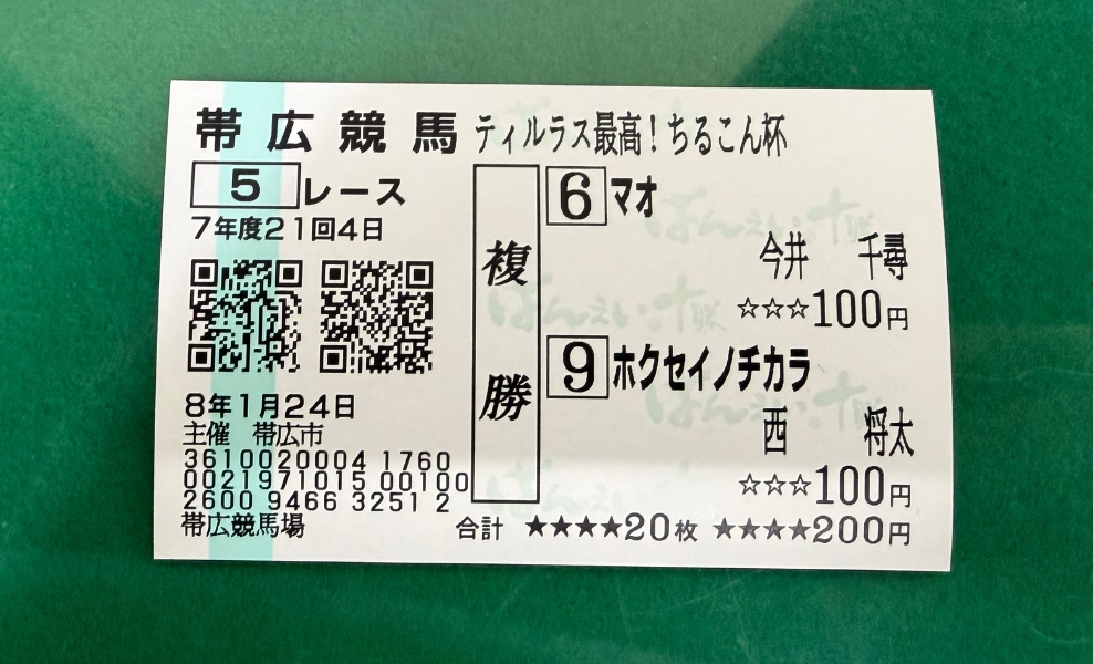 この場合は、帯広・第5レース・複勝・6番と9番の馬に100円ずつ賭けるという意味。