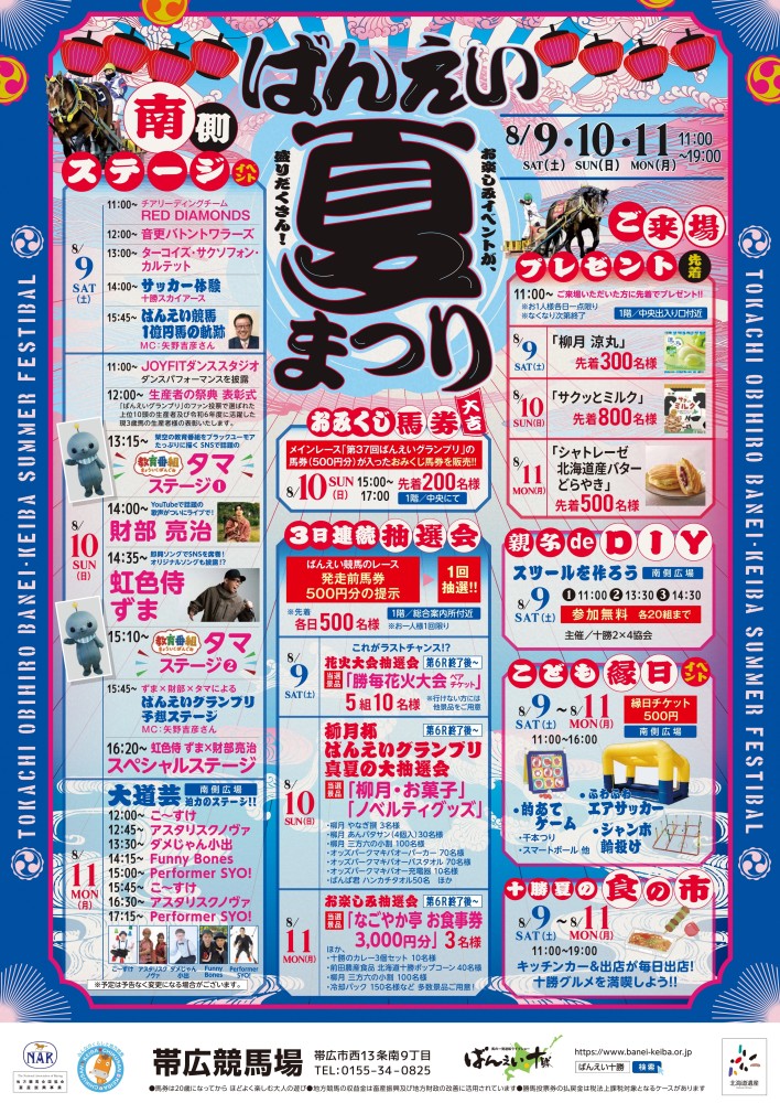8月9日~8月13日の3日間、真夏の帯広競馬場で特別イベント開催!迫力満点のレースに加え、グルメ、音楽ステージ、こども縁日など家族で楽しめる企画が盛りだくさん。毎年恒例となった「柳月杯 ばんえいグランプリ」も開催され、真夏の競馬場が熱気に包まれます。観覧チケットや限定グッズが当たる抽選会、畜産品プレゼントなど、来場者特典も充実!今年の夏は、ばんえい競馬で特別な思い出をつくりませんか?