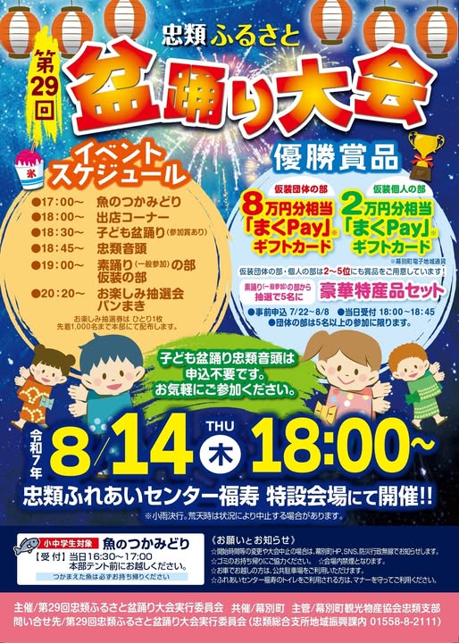また今年は、小中学生を対象とした「魚のつかみどり」イベントも実施され、子どもたちの思い出にもぴったりな内容になっています。仮装盆踊りの優勝者には豪華景品も!夏の締めくくりに、ご家族そろってぜひご参加ください。