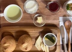 地元ベーカリー店舗のパンを中心にした朝食(メニュー例)地元で人気のベーカリー「toi」や「ますや」のパンやサンドイッチを用意。自家製ヨーグルトやジュース、スープ、牛乳と合わせて、シンプルながら満足感のある内容です。