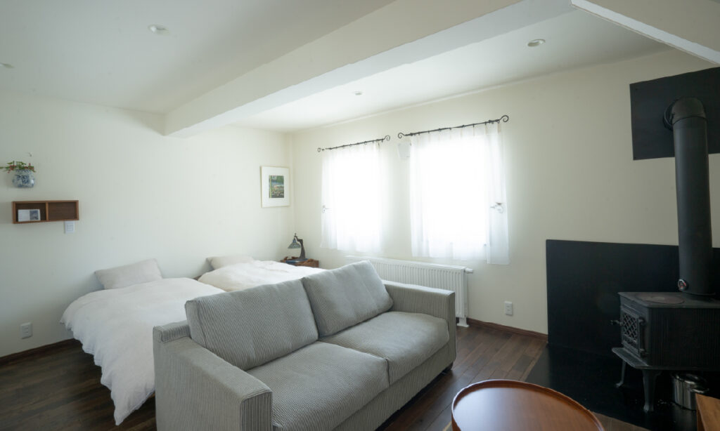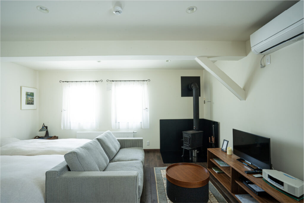 メインハウスの隣に佇むキャビン棟は、2015年にガレージを改装して生まれた特別な宿泊スペースです。白を基調とした外観とモダンな内装が特徴で、こだわりの調度品や薪ストーブが非日常の空気を演出し、穏やかな時間を提供してくれます。