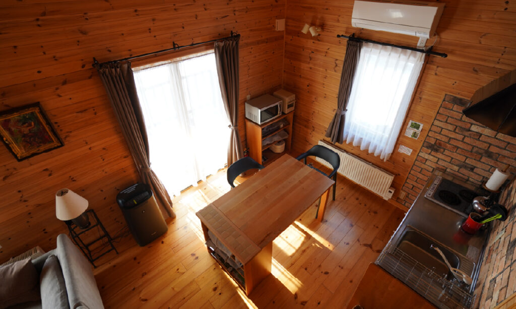 敷地に入ると最初に目に入るのが、ログハウス風に建てられた木造のコテージ棟。木の香りが優しく漂い、高い天井が開放感あふれる居住空間を演出しています。リビングとダイニングキッチンが一体となった広々とした空間に、独立した寝室を配置。屋根裏には遊び心あるロフトもあり、別荘のような非日常感を楽しめます。