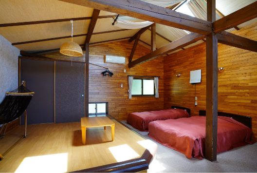 Each log cottage features a skylight and is built from solid timber. There are three “Sunset” cottages, one “Forest” cottage, and three “Doggy” cottages for guests with pets. Each unit accommodates up to five people and comes equipped with Wi-Fi, heating and cooling, foldable hammocks, and Tempur pillows—offering a cozy stay comparable to Scandinavian-style cottages.
