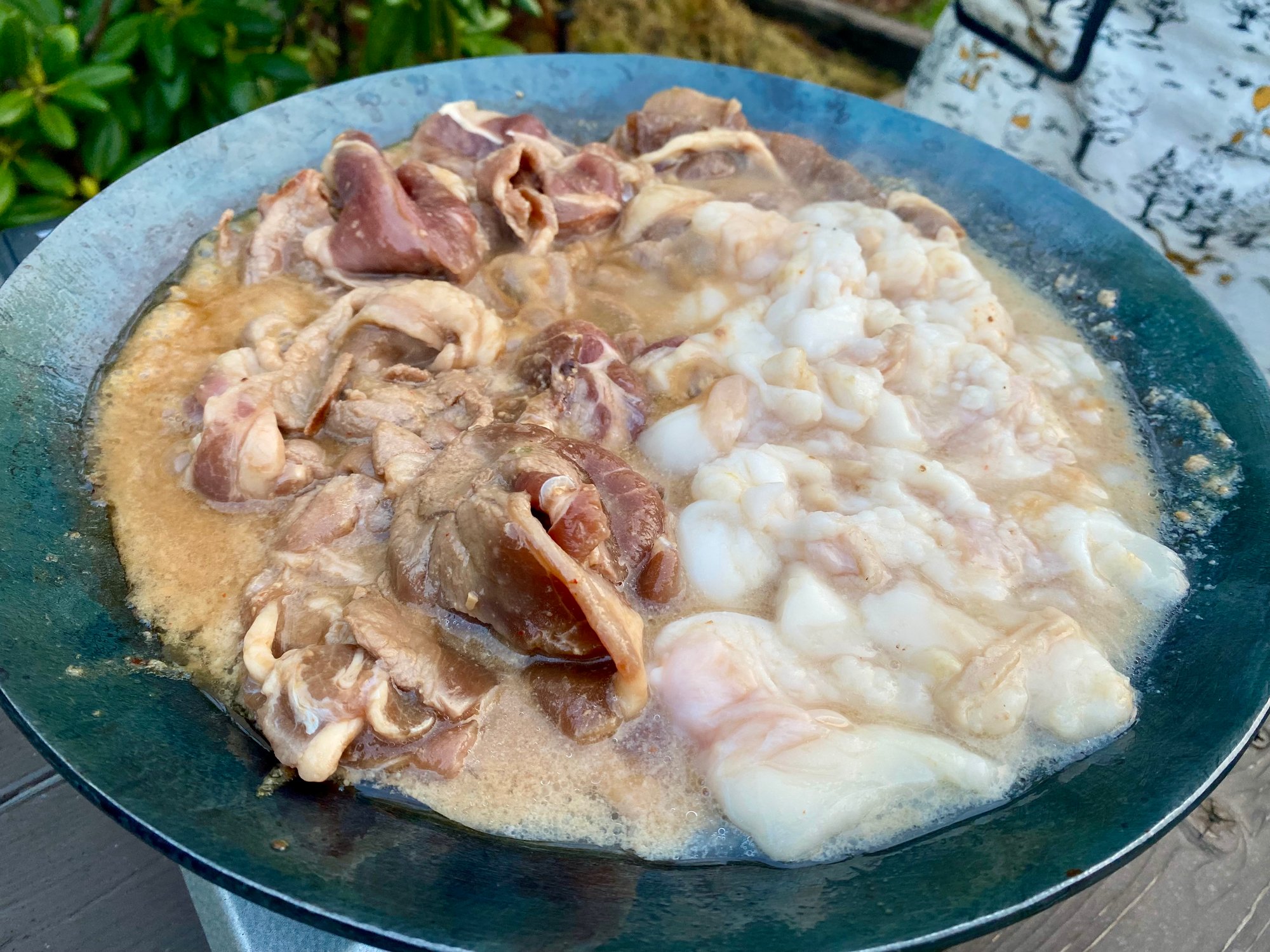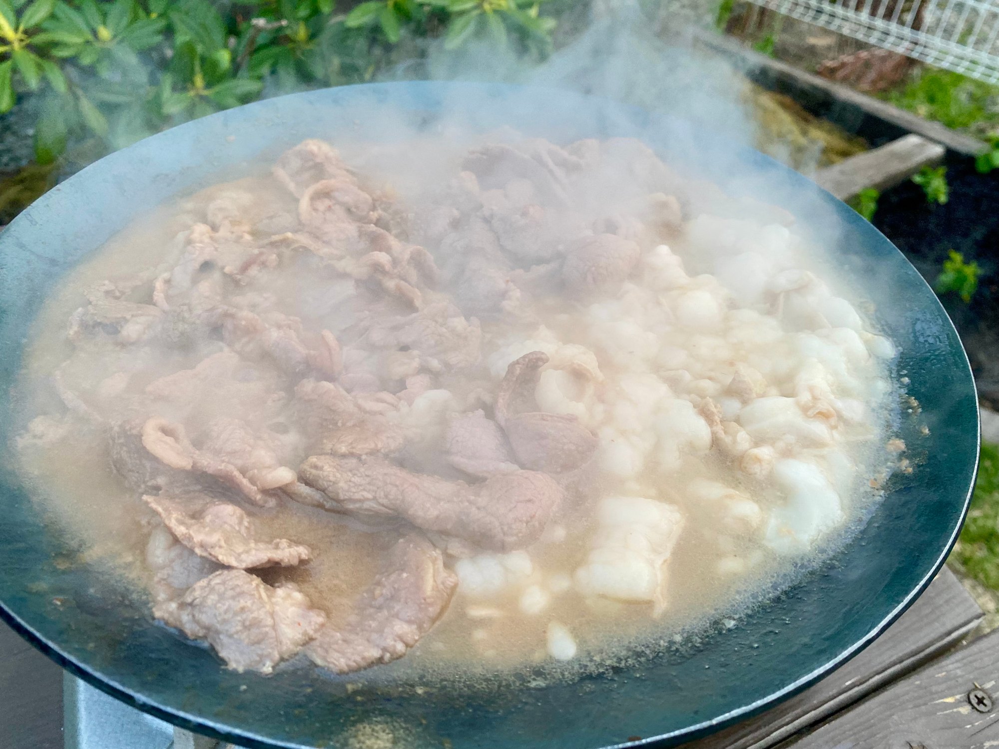 Using a shallow iron pot made especially for Horujin, we placed Yurakucho’s takeout lamb, miso-marinated offal, and onions inside and set it over the heat. Once the meat was cooked through, we served it with freshly steamed rice.