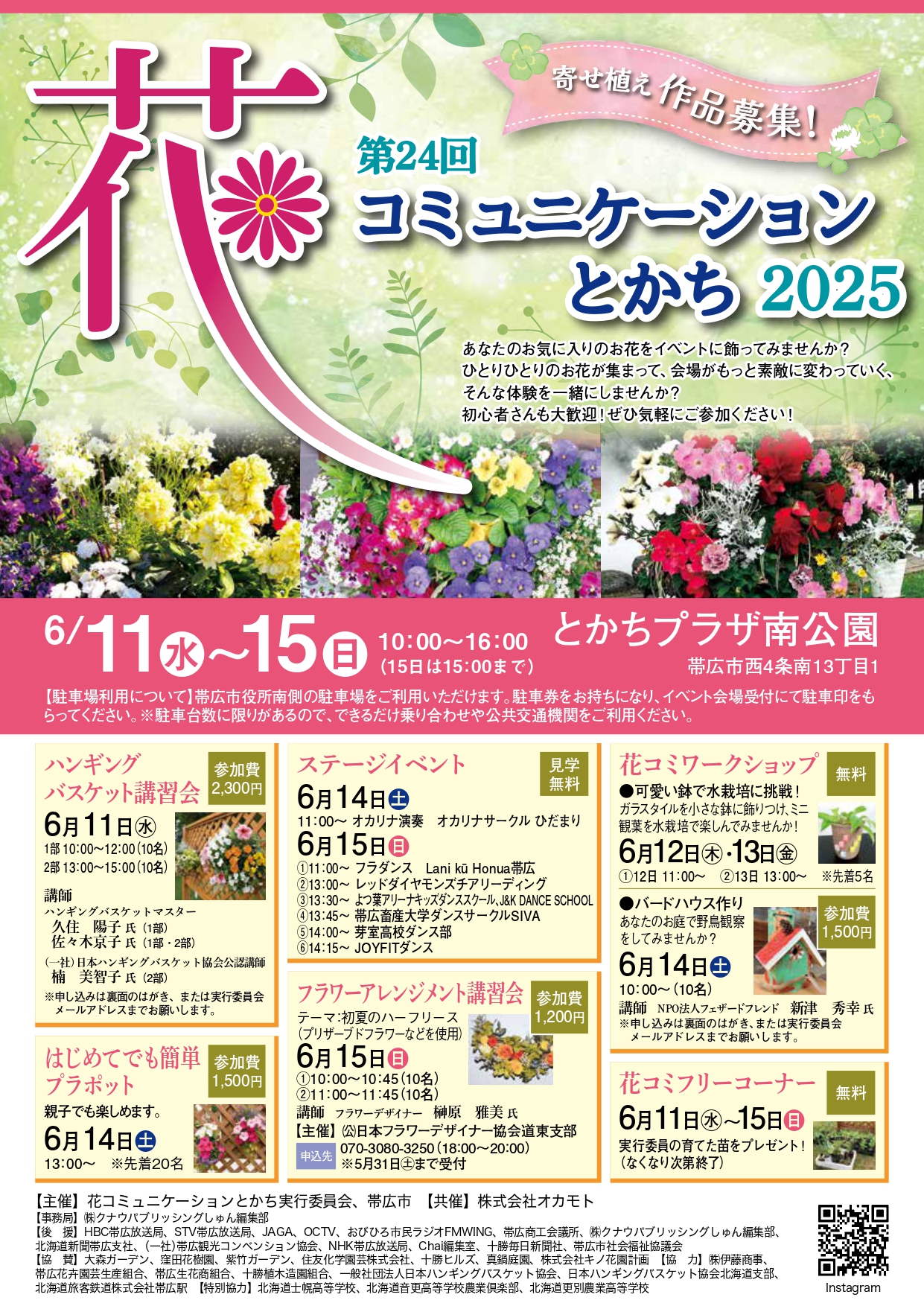 花を通じて人と人のつながりを深める「花コミュニケーションとかち2025」が、6月11日(水)から15日(日)まで、とかちプラザ南公園で開催されます。寄せ植え作品の展示をはじめ、ワークショップやステージイベント、苗プレゼントなど、多彩なプログラムが5日間にわたって展開されます。