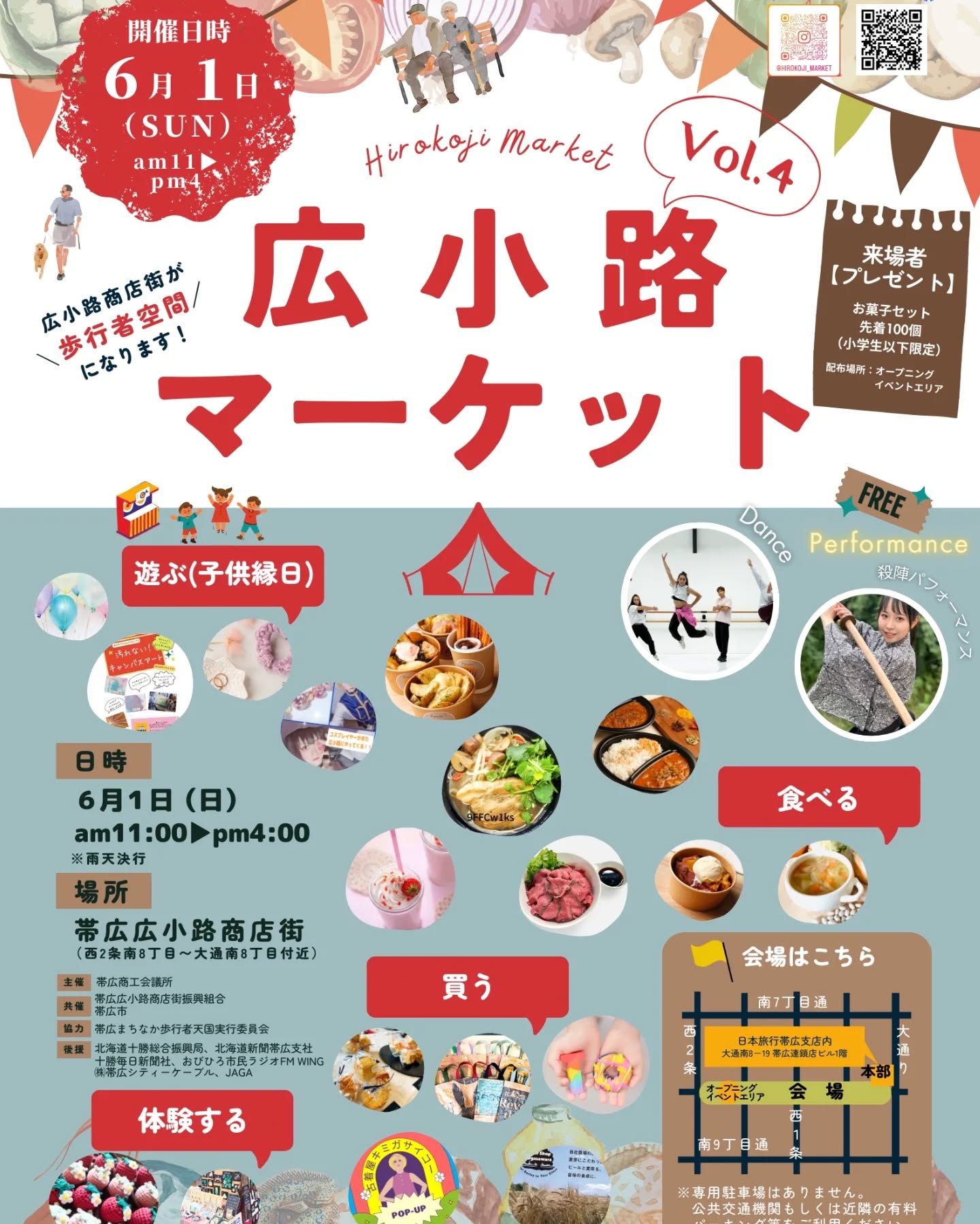 帯広市中心部の広小路商店街が歩行者天国に変わる一日限りのイベント「広小路マーケット Vol.4」が、6月1日(日)に開催されます。会場となるのは、西2条南8丁目から大通南8丁目付近までの広小路商店街エリア。食べて、遊んで、買って、体験できる、にぎやかで楽しいマルシェが広がります。