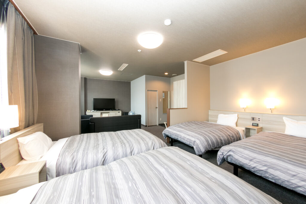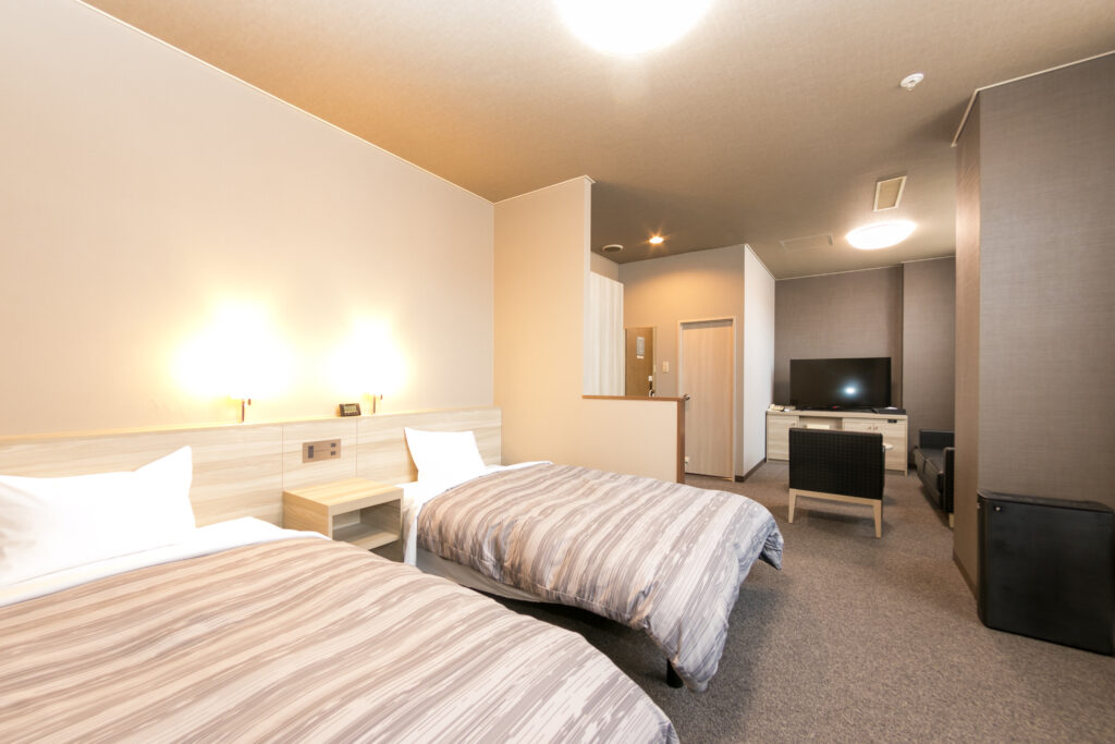 客室はフォースルームやツインルーム、和室など多彩。全室に無料Wi-Fiと加湿機能付き空気清浄機を完備し、快適な滞在をサポートします。
