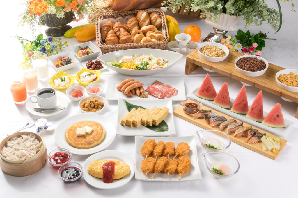 朝は20種類以上の料理が並ぶバイキングです。焼き鮭や卵料理、納豆、煮物などの和食と、パンやサラダ、フルーツなど洋食が食べられます。