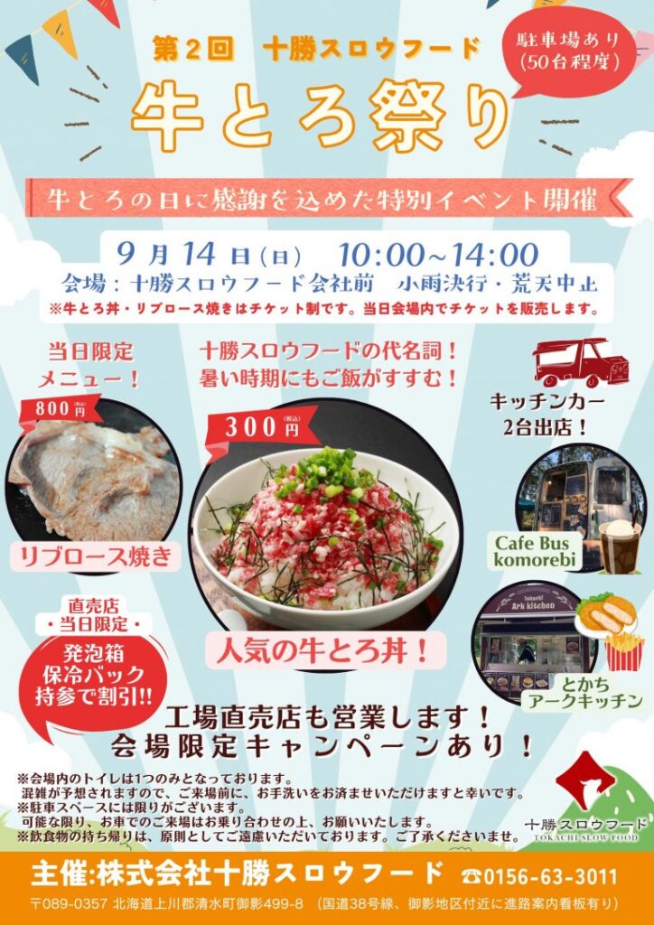 十勝スロウフードの代名詞「牛とろフレーク」を楽しめる特別イベント「牛とろ祭り」が、今年も本社前で開催されます!昨年「牛とろの日(9月16日)」にあわせて初めて開かれ、多くの来場者でにぎわった同イベント。今回は2回目の開催となり、人気の牛とろ丼を300円(約700食限定)で味わえるほか、リブロース焼き(800円)も提供されます。