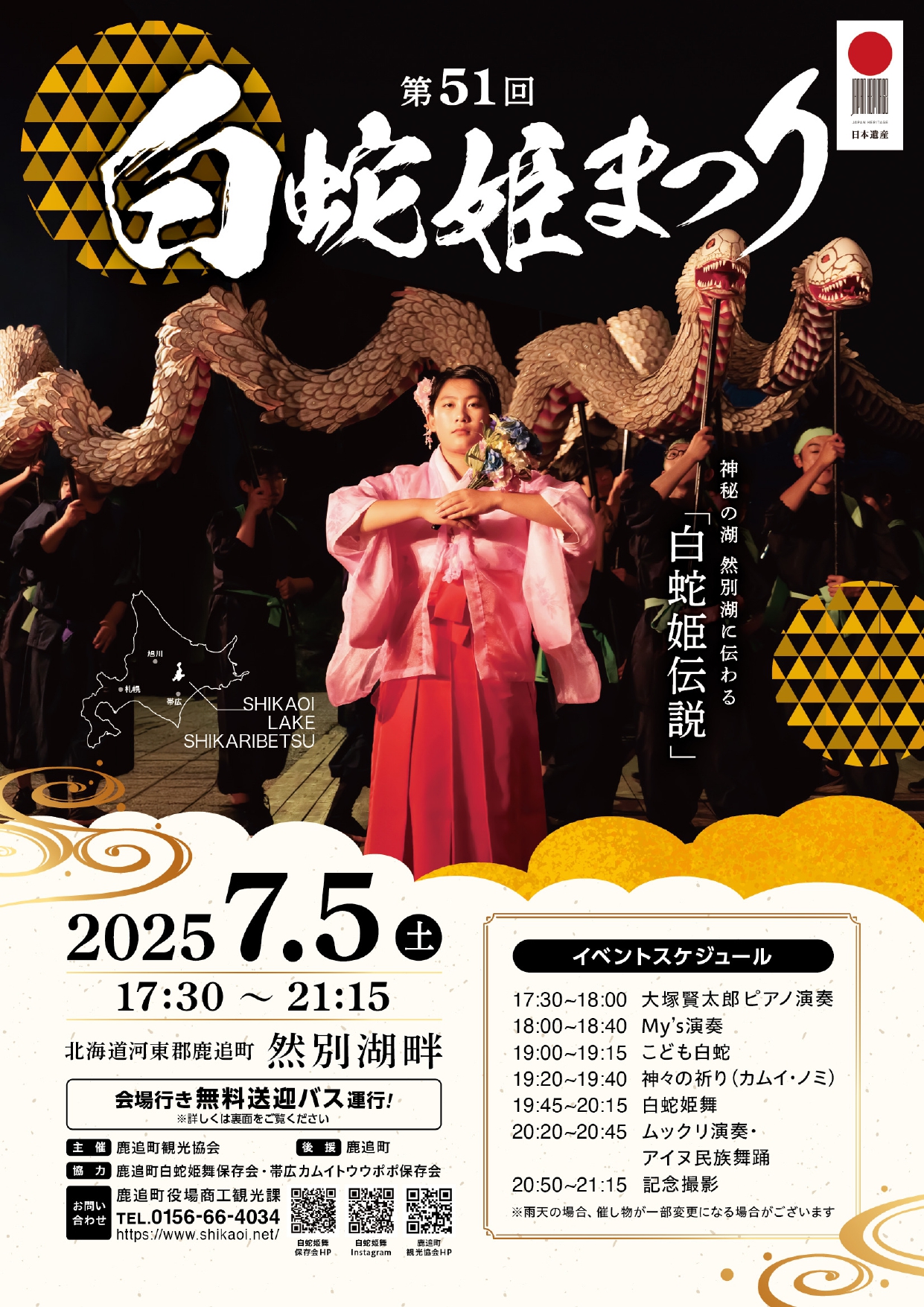 湖面に夕闇が落ちる頃、全長13mの白蛇が静かにうねり出す―。2025年7月5日(土)、鹿追町・然別湖畔でアイヌ伝説を舞に昇華した年に一度の祭典「白蛇姫まつり」が開催されます。神々の祈り〈カムイ・ノミ〉やムックリの調べ、白装束の“姫”が導く親子蛇のダイナミックな蛇踊り。十勝の花ガーデンを巡った旅人も、この夜だけは湖の神秘に身を委ねてみませんか。帯広駅発着の無料送迎バス付きでアクセスも安心です!