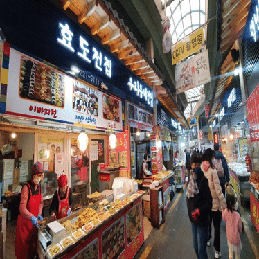 ホットクやタッカンジョン(韓国唐揚げ)など、韓国の食を楽しめの他、日用雑貨や靴など専門店が並びます。
