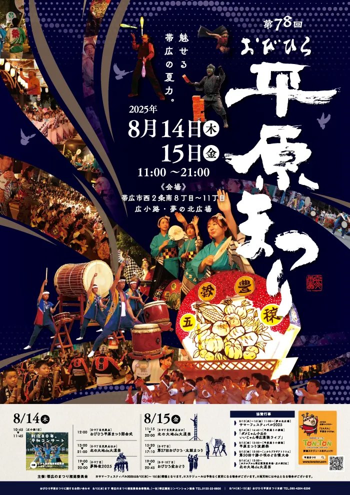 | 15:20~17:10 | 第27回平原・太鼓まつり (西2条南8~9丁目) ※雨天時は13:30から 帯広市民文化ホールにて開催 |