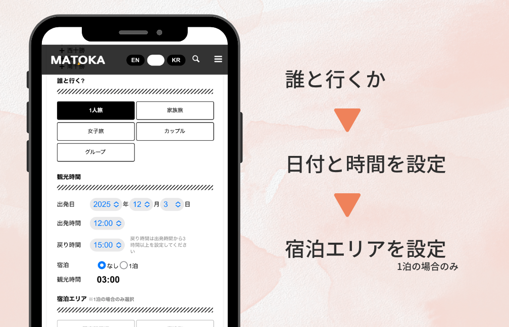 一人旅、家族、女子旅など、同行者を選択してください。選択肢に合わせたぴったりの行き先をおすすめしてくれます。