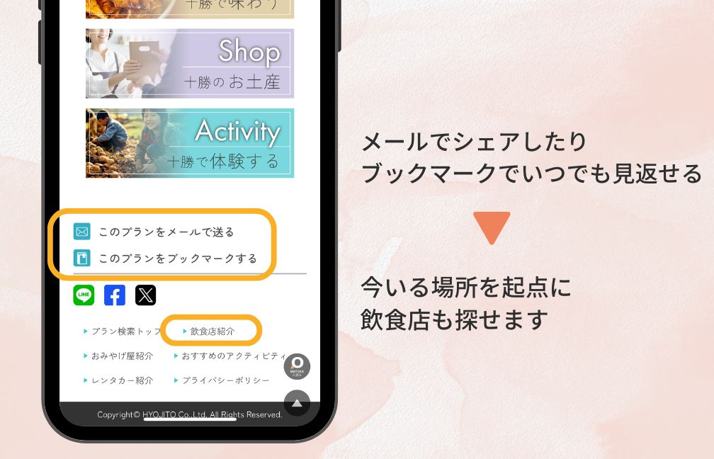選んだコースは、友達にシェアしたり、ブックマーク保存でいつでも確認できます。ほかにも、近くの飲食店情報も見れるので、今いる場所から近い美味しいお店を探すのも簡単!