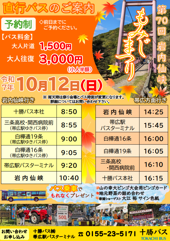 「岩内仙峡もみじまつり」に合わせて会場までの直行バスが運行します。