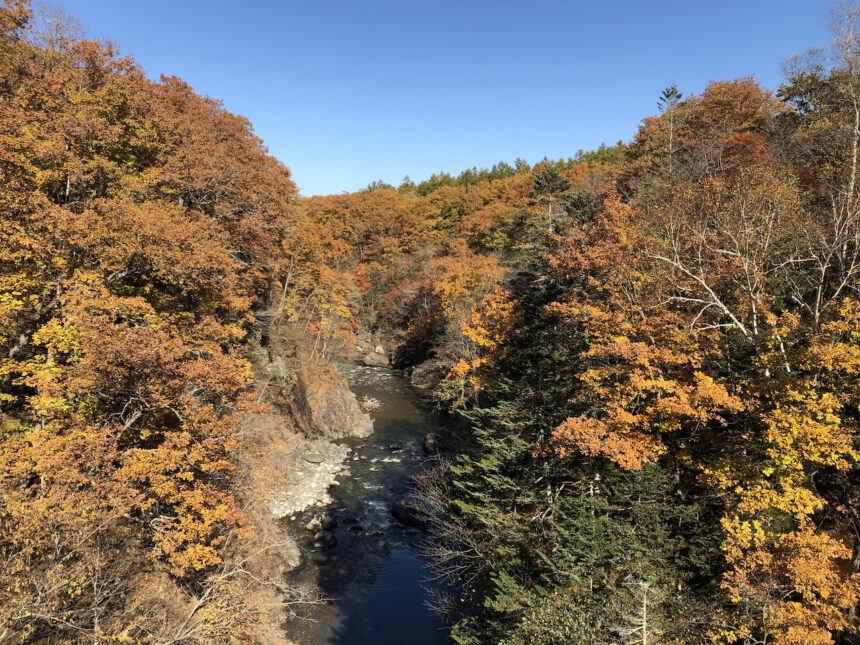 中でも、渓谷にかかる赤い吊り橋からの眺めは格別。色鮮やかな紅葉と清らかな水の流れが織りなすコントラストは、絵画のような美しさです。