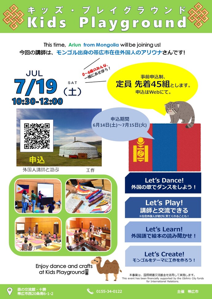 帯広市で定期開催されている国際交流イベント「キッズ・プレイグラウンド」。7月19日(土)はモンゴル出身のアリウナさんを講師に迎え、「モンゴル」をテーマにした特別プログラムが開催されます!