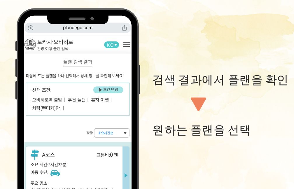 코스 시간과 출발·도착 지점을 설정합니다. 2025년 12월 기준으로는 오비히로 공항과 오비히로 역을 선택할 수 있지만, 가까운 미래에는 숙소나 현재 위치에서도 플랜 생성이 가능해질 예정입니다.