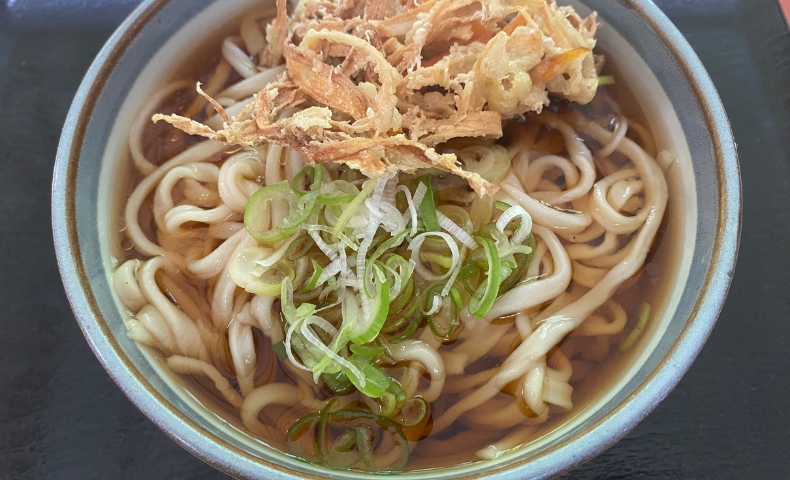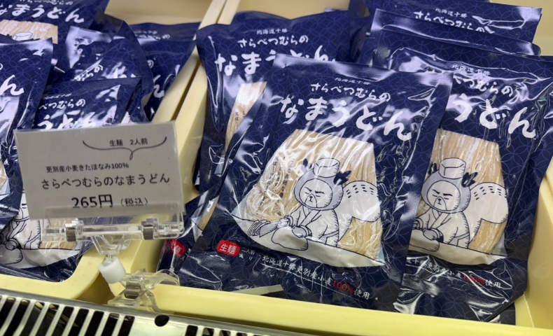 레스토랑의 인기 메뉴는 사라베츠산 밀 ‘키타호나미’를 100% 사용한 ‘사라베츠 생우동(¥600)’. 생면 특유의 매끈한 식감으로 아이부터 어르신까지 쉽게 즐길 수 있습니다. 우엉튀김(고보텐)이나 츠키미(달걀)로 주문해도 650엔으로, 가성비도 훌륭합니다. 이날은 ‘고보텐 우동’을 맛보았습니다.