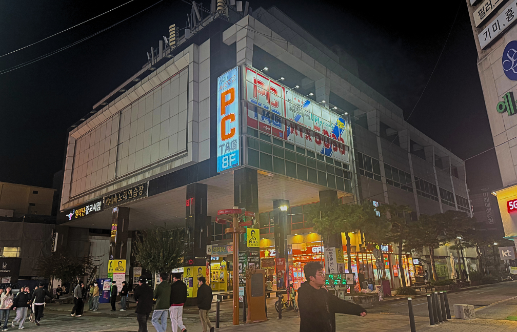 清州市内の店舗は、メインストリートのソンアンキルにあり、大きなディスプレイとガラス張りの建物が特徴です。