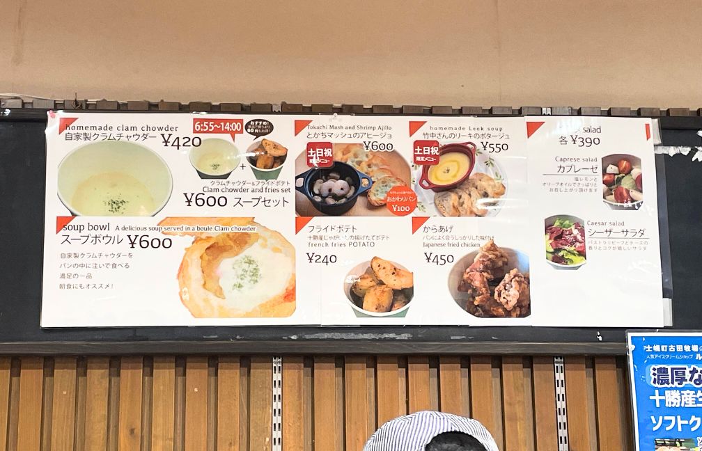 パンを選んでレジに進むと、掲げられたボードの「スープ」の文字に目を奪われます。麦音にはレジの奥にイートインスペースがあり、買ったパンと一緒にサイドメニューを食べることもできるんです。飲み物は店内の牛乳やパックジュースか、イートインコーナーのドリンクバーで紅茶やコーヒーを買うことができます。