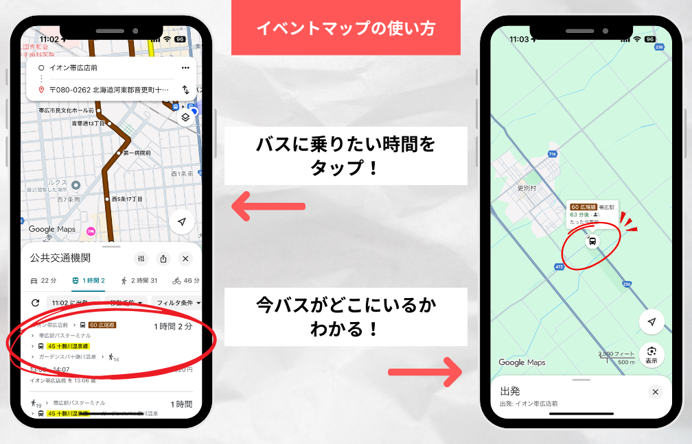 - リアルタイムのバス運行状況も確認できる(帯広は対応エリア!)