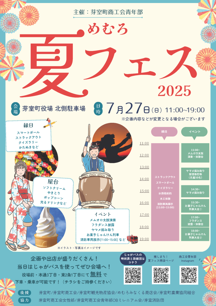 芽室町の夏の風物詩、「めむろ夏フェス2025」が7月27日(日)に開催されます。スマートボールやストラックアウト、クイズラリー、かたぬきなど、子どもたちが夢中になる縁日ブースが充実!ソフトクリーム、やきとり、ポップコーン、光るドリンクなど、夏にぴったりのグルメも満載です。