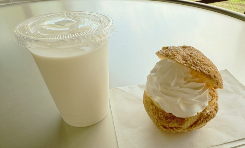 イートインスペースでは、浦幌産の新鮮な牛乳を1杯250円で提供。さらに牛乳を使った絶品スイーツも楽しめます。中でも「Wクリーム入りのシュークリーム(350円)」は、濃厚でなめらかな味わいが人気です。