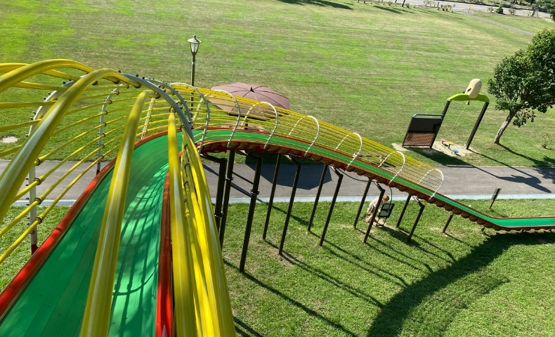 令和5年にリニューアルされた大型遊具は、山の斜面を生かしたダイナミックな作り。