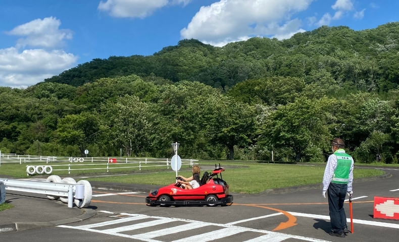 交通ルールを学べるゴーカートは親子二人乗りOK。身長140cm以上の子どもなら一人乗りもできる。