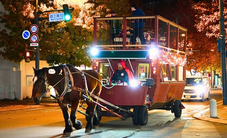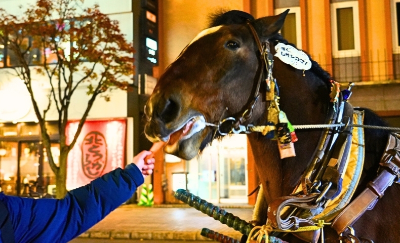 帯広駅近くから出発する「馬車BAR」は、夜の街をゆっくり巡る人気のナイトアクティビティ。ばんえい競馬で活躍した元レース馬・ムサシコマが馬車を引き、観光客を静かに乗せて走ります。