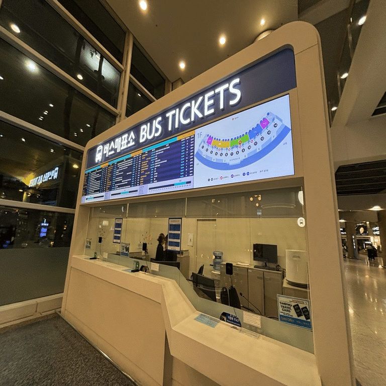空港連絡バス:仁川空港からソウル市内の各方面に向かうバスが出ています。バスチケットは窓口・券売機で購入可能。窓口は現金・クレジットカード、券売機はクレジットカードのみ対応可能でした。