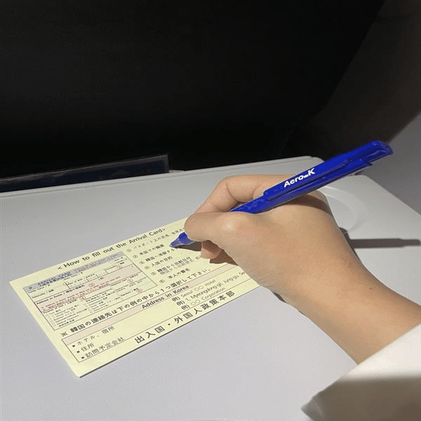 機内で日本人用のアライバルカードを記入!(2025年12月末で紙のカードは廃止されました) ※仁川空港では、2026年1月から出入国自動審査が導入され、 事前にe-Arrival cardへの登録が必要になりました。 詳しくは、仁川空港のHP等をご確認ください。