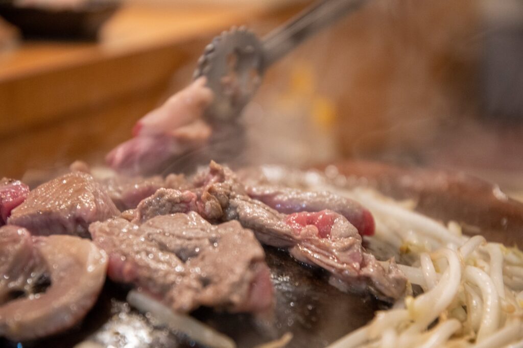 帯広のジンギスカンは、素材そのものの味わいが感じられるのが魅力です。炭火の香りがふわりと立ちのぼり、焼ける音が食欲を刺激します。