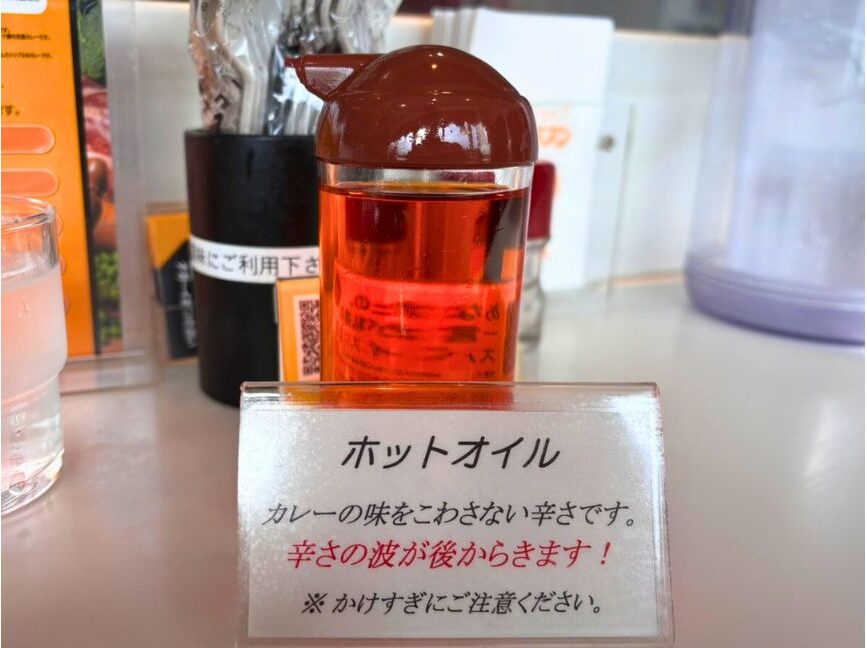 また、テーブルには唐辛子オイルが置いてあります。カレーの味を壊さず、辛味を加えられるので、ルーの辛さは控えめに、食べながら唐辛子オイルをかけて調整するのもおすすめです。