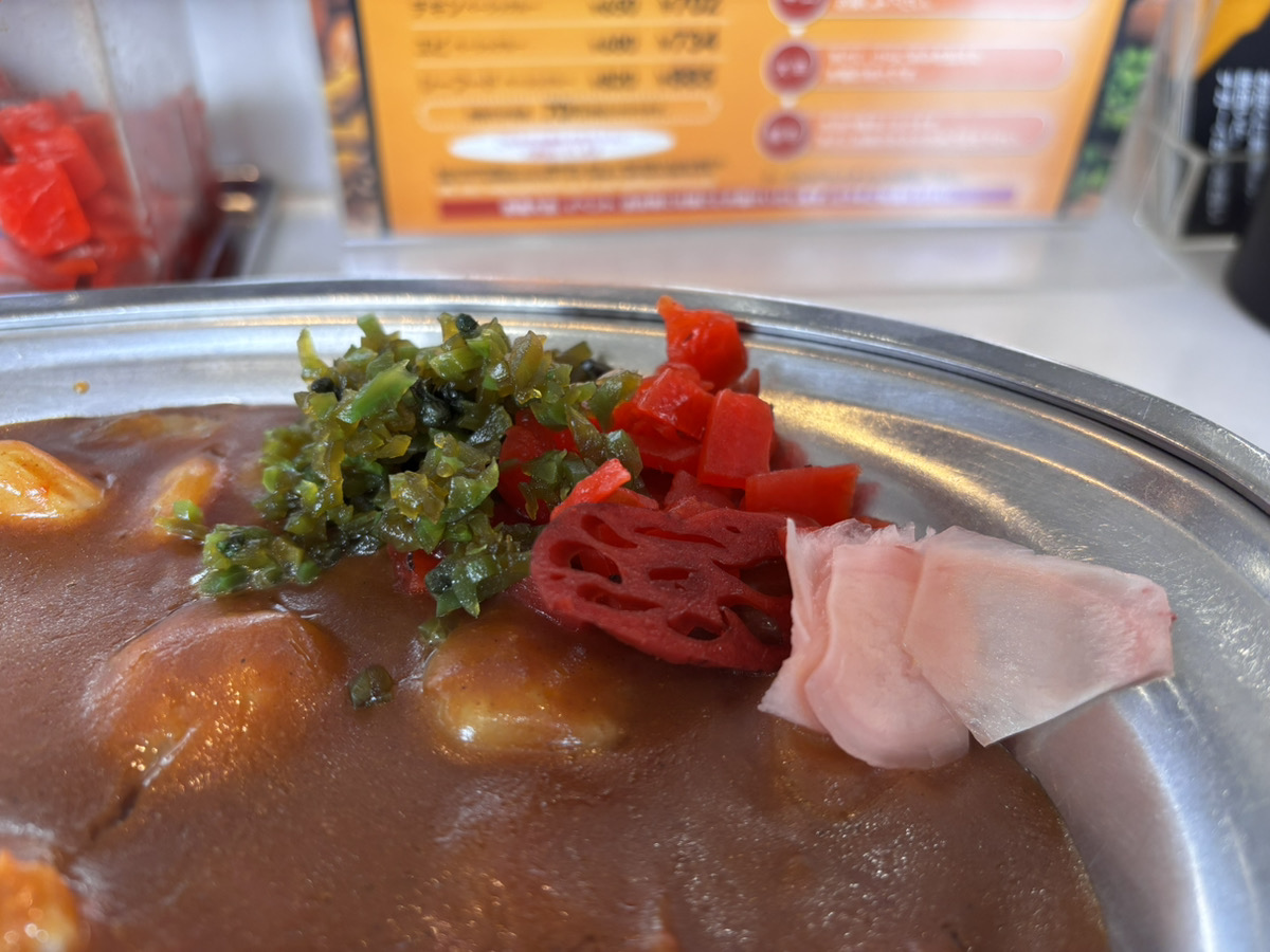 また、テーブルにおいてある薬味3種にも注目です。福神漬け、ガリ、みどりのやつ…
