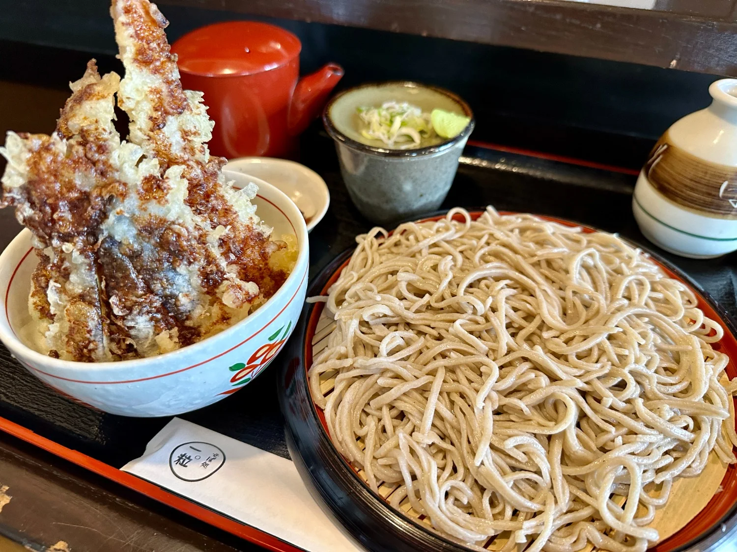 鹿追産そば粉を太め二八で打ち、モチモチとした噛み応え。甘め鰹つゆと好相性。海老・白身・舞茸・野菜3種が乗る天丼セットが 1,500 円と破格。卓上の“宗谷の塩”で麺を味変すると粉の甘みが立ちます。