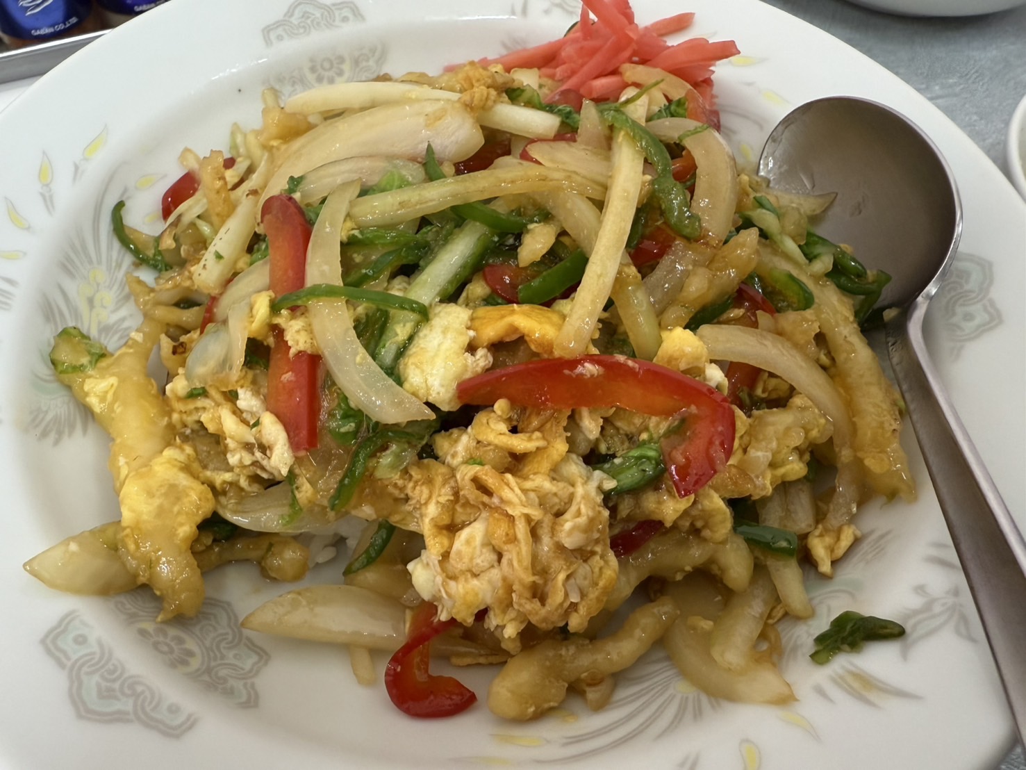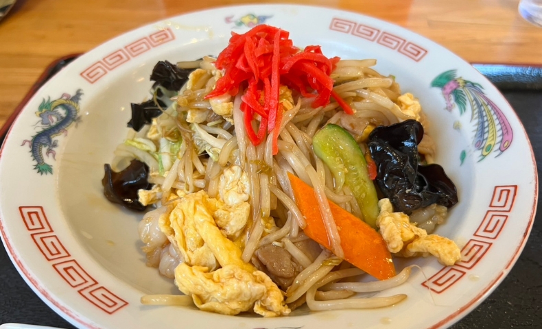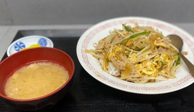 シンプルながらも完成度の高い一皿。ここでいただいた中華ちらしは、初めての人にもおすすめしたい“お手本的な味”です。具材はもやし、ピーマン、豚肉、玉ねぎといたってシンプル。中でもシャキシャキ食感のもやしが絶妙で、食感のアクセントになっています。ほのかな甘みを感じるタレに、ピリッと効いた胡椒がいいアクセント。ご飯との相性は抜群で、スプーンが止まらなくなる美味しさです。
