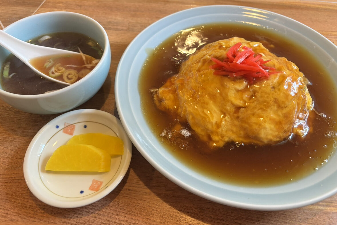 食欲をそそる艶やかな見た目。ふわとろの卵に、ほどよい酸味とコクのある餡がたっぷり絡みます。
