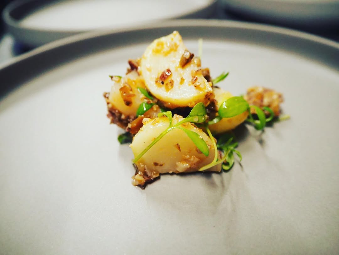 写真はコースの1品で提供された「カブとホタテ、ホタルイカのタルタル和え」です。