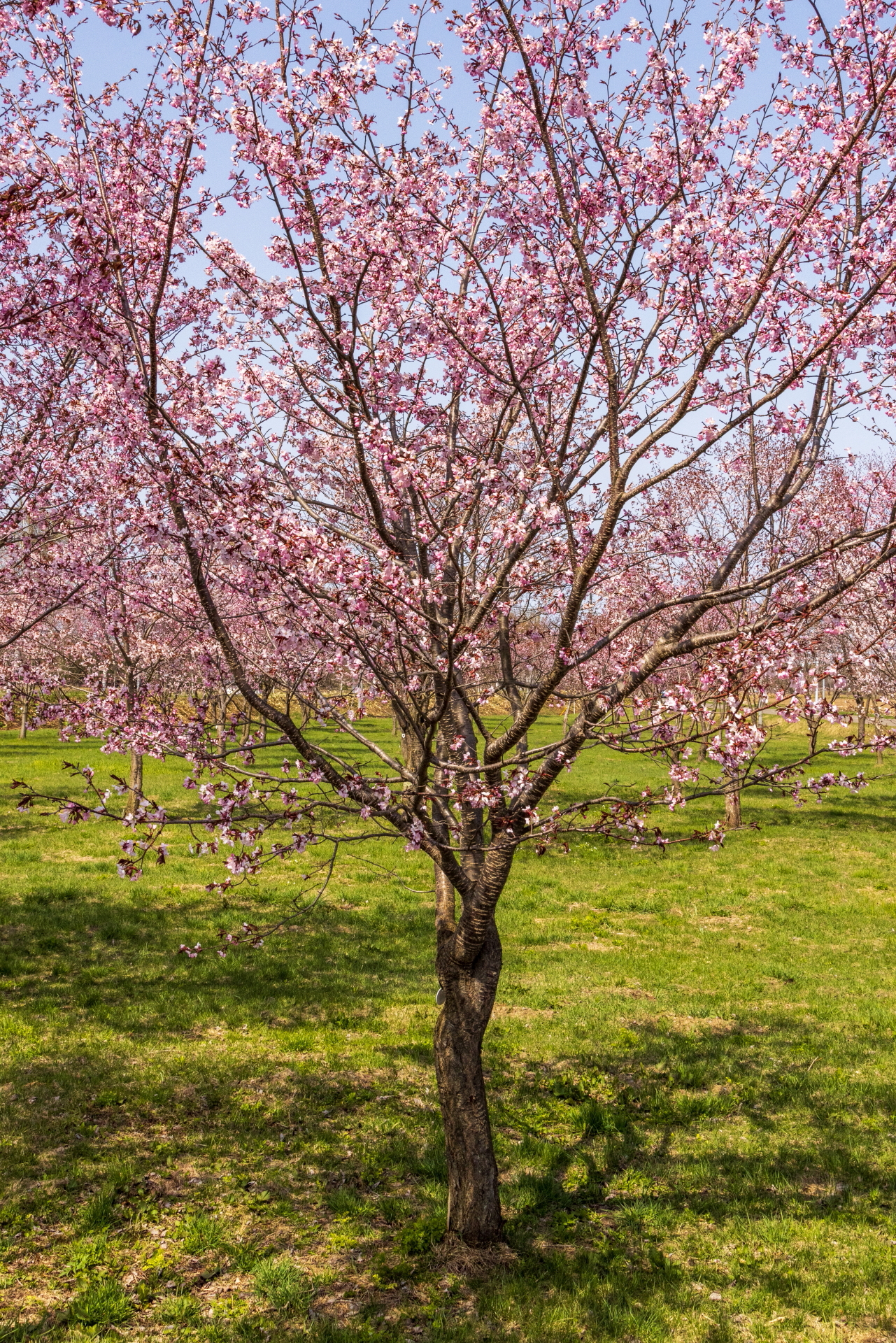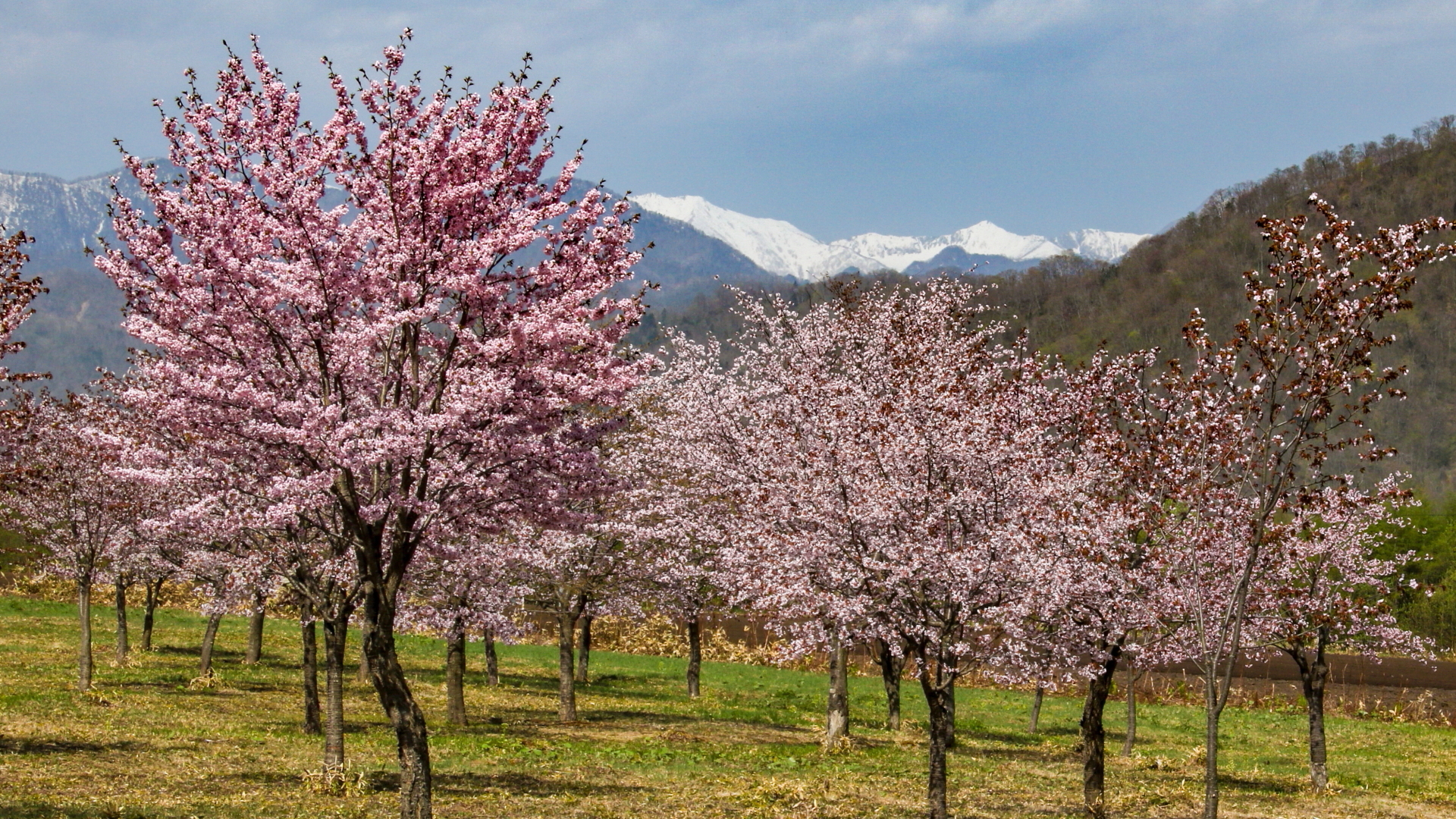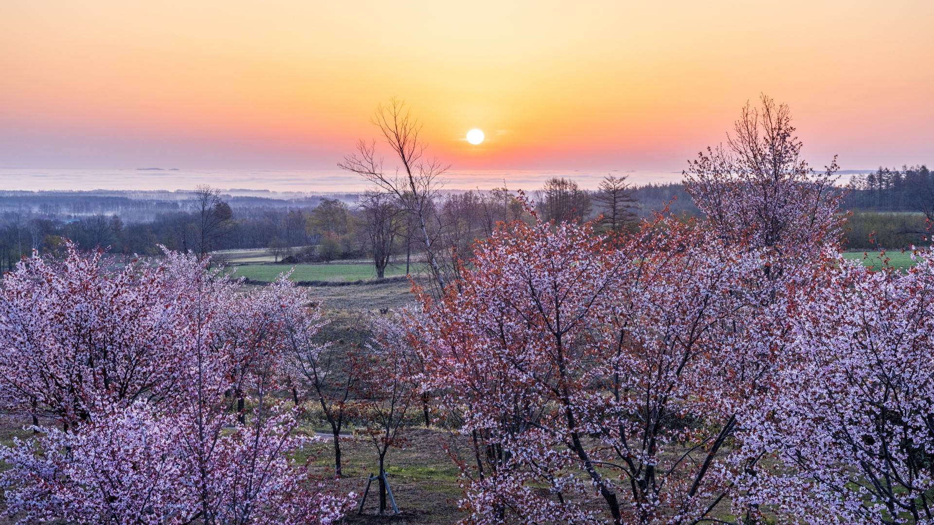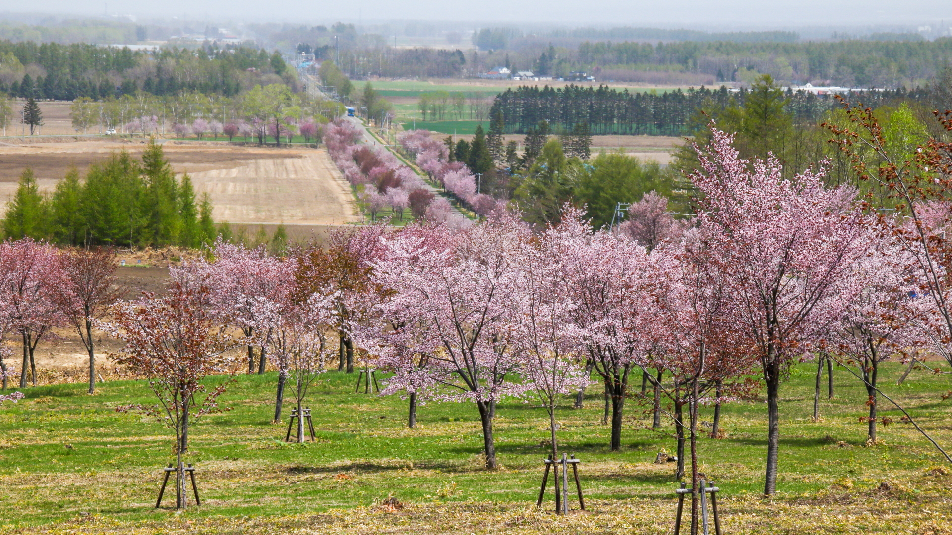 六花亭が2000年に寄贈したエゾヤマザクラ約1000本(現在は約800本)が育つ、入園無料の桜パーク。帯広市街から車で40分、中札内の田園に突如あらわれるピンクの丘は、平成27年設置の展望台から十勝平野と日高山脈を一望できます。