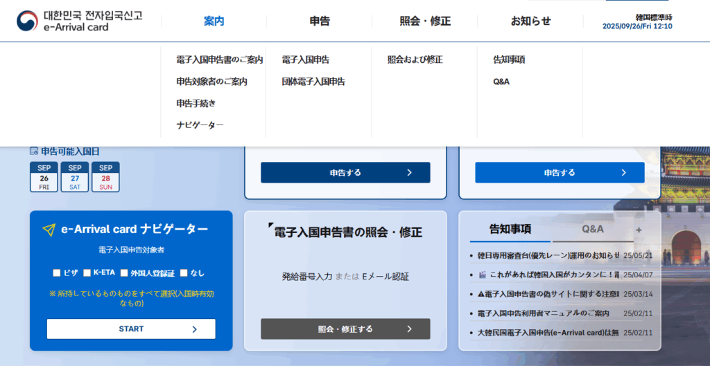 韓国電子入国申告書(e-Arrival Card)ホームページ