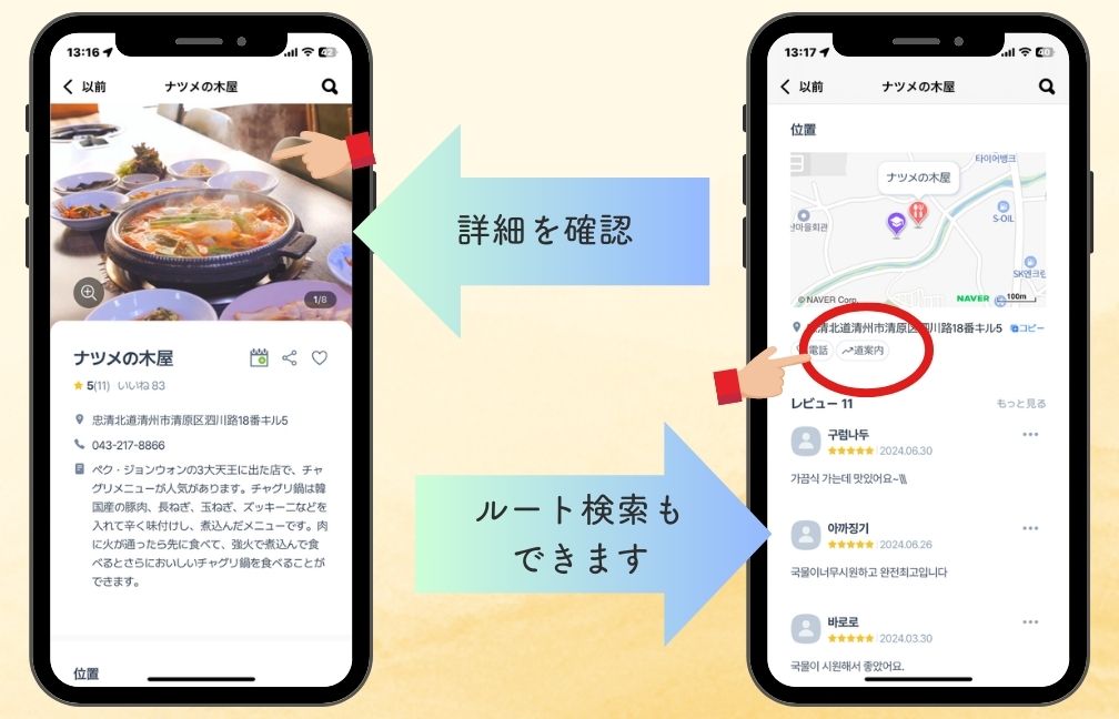 - 道案内:NAVER Map(日本語UI・韓国語表記で検索)