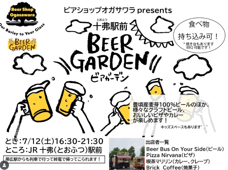 十勝・豊頃町の夏の恒例イベント「十弗(とおふつ)駅前ビアガーデン」が今年も開催されます!主催は、自家農場産の麦芽を使用したクラフトビールで人気の「Beer Shop Ogasawara」。会場はJR十弗駅前、列車でのアクセスも可能な好立地です。