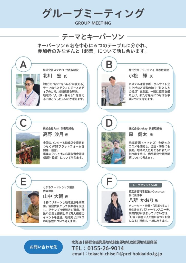 「とかちでツナガルミーティング」とは、地域と関わりながら活動する人たちの体験談を聞き、参加者同士で語り合う交流型イベント。今回の企業編では、十勝で実際に起業し活躍しているキーパーソン6名が登壇し、トークセッションとグループミーティングを行う予定です。「なぜ起業したのか」「どんな壁があったのか」「地域で続けていくための工夫」など、実体験に基づく話を共有します。