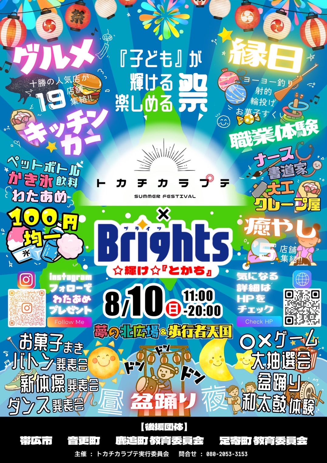 前回7,000人を超える来場者で大盛況となったトカチカラプテが、8月10日(日)に開催決定!今回の「トカチカラプテ×Brights」も、子どもが主役となって一日中楽しめる、笑顔いっぱいの夏まつりになる予定。盆踊りやステージ発表、職業体験、キッチンカーや縁日など、多彩なコンテンツがそろう“遊びのテーマパーク”のような催しで、大人も童心に帰る一日になることでしょう。十勝の熱いイベントを帯広駅前の夢の北広場で体験しよう!